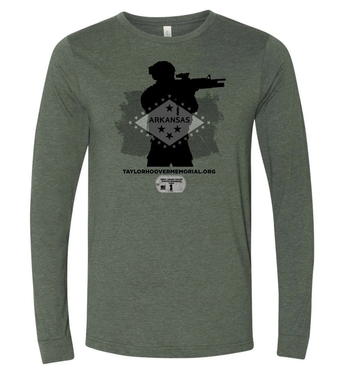 Long sleeve forest green t-shirt features a silhouette of SSGT Hoover, the Arkansas state flag, and the SSGT Darin Taylor Hoover Memorial logo.